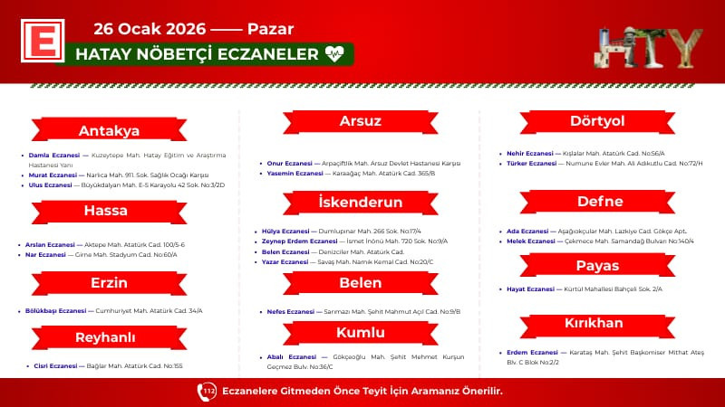 26.01.2026 HATAY NÖBETÇİ ECZANELER