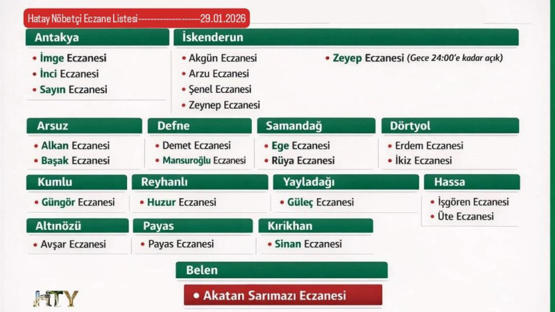 29.01.2026 HATAY NÖBETÇİ ECZANELER