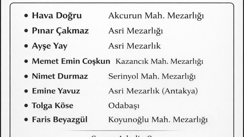 22.01.2026 tarihinde Hatay'da vefat eden vatandaşlarımıza Allah'tan rahmet sevenlerine başsalığı dileriz.