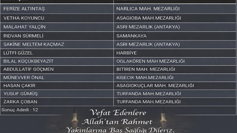 HATAY İLİ 30.01.2026 TARİHİNDE VEFAT EDEN VATANDAŞLARIMIZ