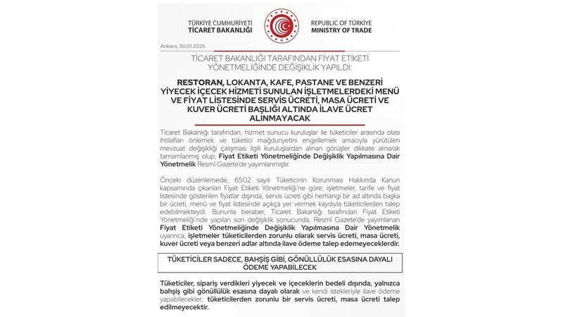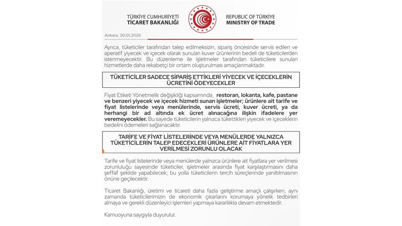 Fiyat Etiketi Yönetmelik değişikliği kapsamında, restoran, lokanta, kafe, pastane ve benzeri yiyecek ve içecek hizmeti sunan işletmeler; ürünlere ait tarife ve fiyat listelerinde veya menülerinde, servis ücreti, kuver ücreti ya da herhangi bir ad altında ek ücret alınacağına ilişkin ifadelere yer veremeyeceklerdir. Bu sayede tüketicilerin yalnızca tükettikleri yiyecek ve içeceklerin bedelini ödemeleri sağlanacaktır.