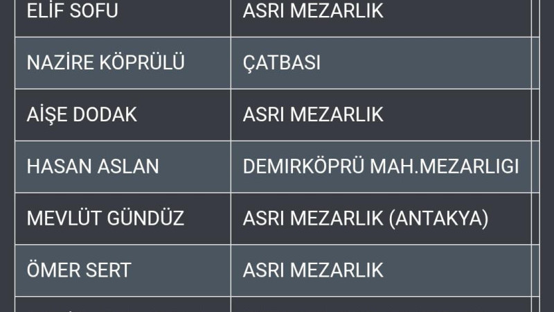 10.02.2026 HATAY DA VEFAT EDEN VATANDAŞLARIMIZIN LİSTESİ